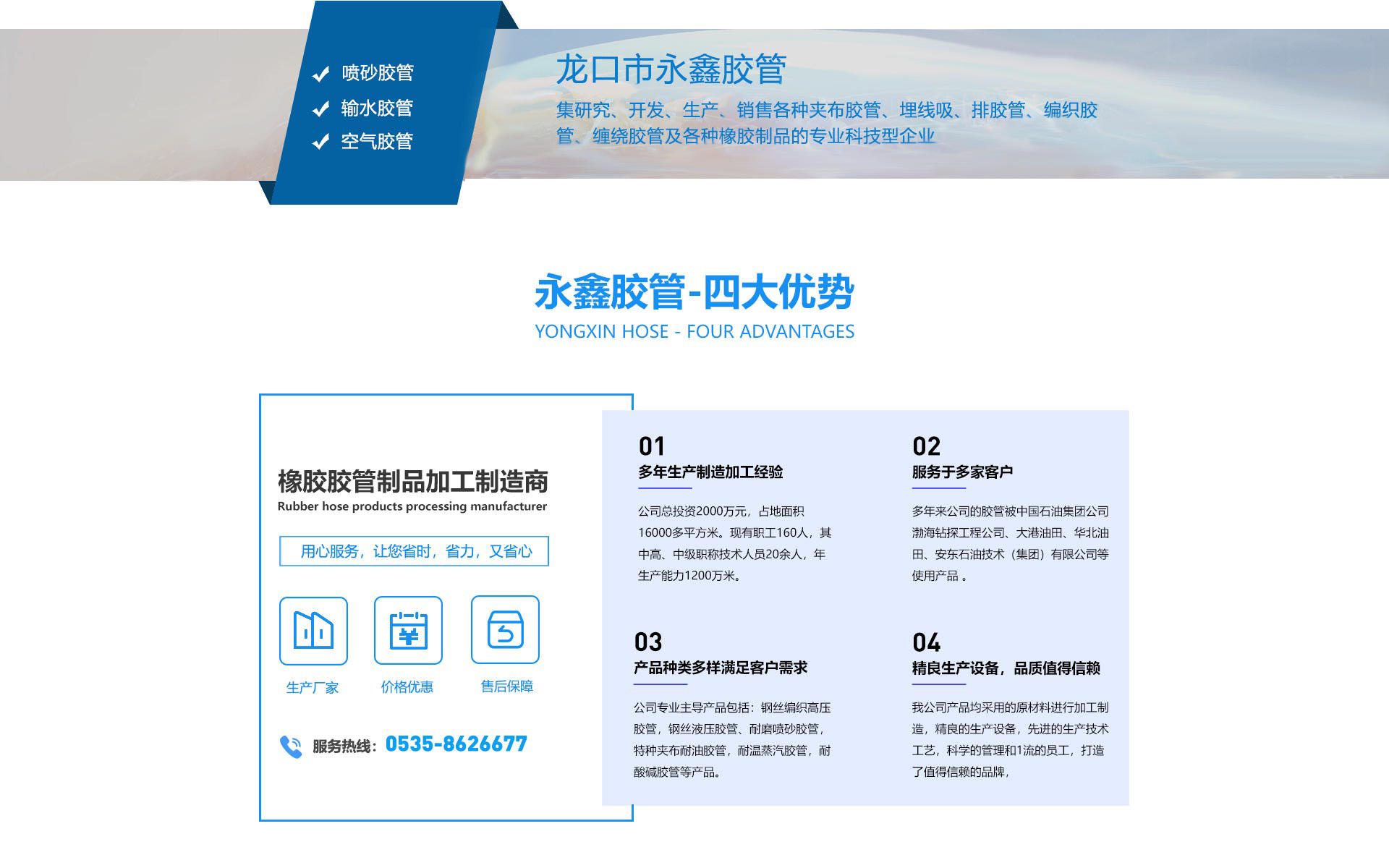 龍口市永鑫膠管有限公司始建于1979年。位于山東半島北端——龍口市,毗鄰龍口港、威烏高速公路和大萊龍鐵路,商業(yè)運(yùn)輸,交通方便,地理位置好。公司總投資2000萬元,占地面積16000多平方米。現(xiàn)有職工160人,其中高、中級職稱技術(shù)人員20余人,年生產(chǎn)能力1200萬米。多年來公司的膠管被中國石油集團(tuán)公司渤海鉆探工程公司、大港油田、華北油田、安東石油技術(shù)(集團(tuán))有限公司等使用產(chǎn)品我公司迎著十八界三中全會(huì)的改革大潮始終闊步向前,目前我公司主要從事高低壓橡膠軟管、鉆探膠管、夾布膠管、噴砂膠管、橡膠管帶制品,等產(chǎn)品的生產(chǎn)和研發(fā),主導(dǎo)產(chǎn)品包括:生產(chǎn),研制高低壓橡膠軟管、輸送皮帶等以橡塑為主的產(chǎn)品,擁有各類進(jìn)口,國產(chǎn)生產(chǎn)設(shè)備120多臺(tái)套,化驗(yàn),分析,試驗(yàn)儀器設(shè)備種類多,檢測手段完善。我公司產(chǎn)品均采用的原材料進(jìn)行加工制造,精良的生產(chǎn)設(shè)備和穩(wěn)定技術(shù)工藝,科學(xué)的管理,打造了客戶信任的牌子,先后與多家石油、化工、汽車制造等大型國有企...